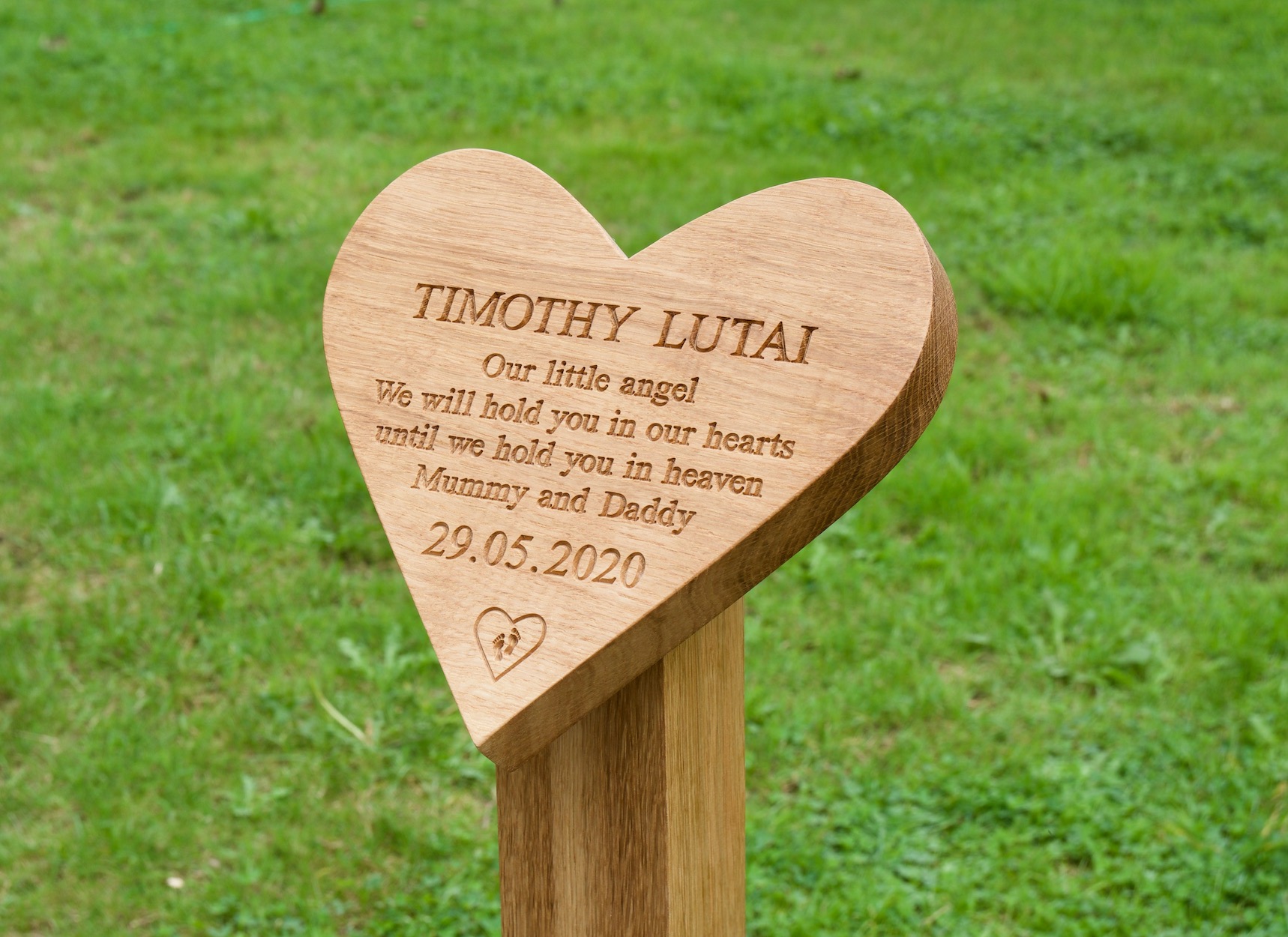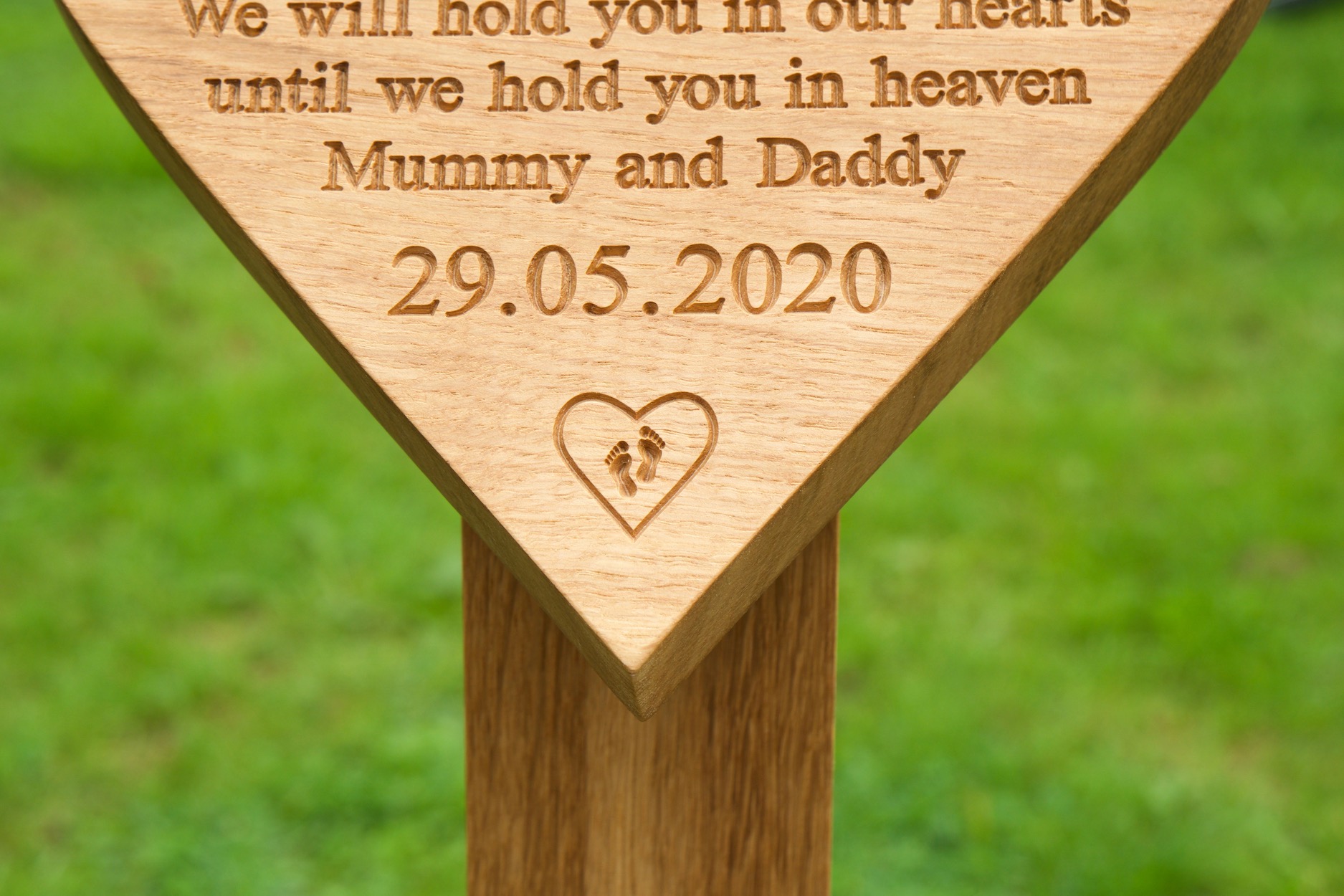 Our eco friendly engraved solid oak grave markers feature a solid oak plaque cut into the shape of a heart, mounted on a 3 inch square solid oak post. The post comes 60cm long, giving you at least 30cm to be secured into the ground. The plaque itself is made from a single solid piece of superior grade English Oak, fitting to a substantial solid oak post at 45 degrees.