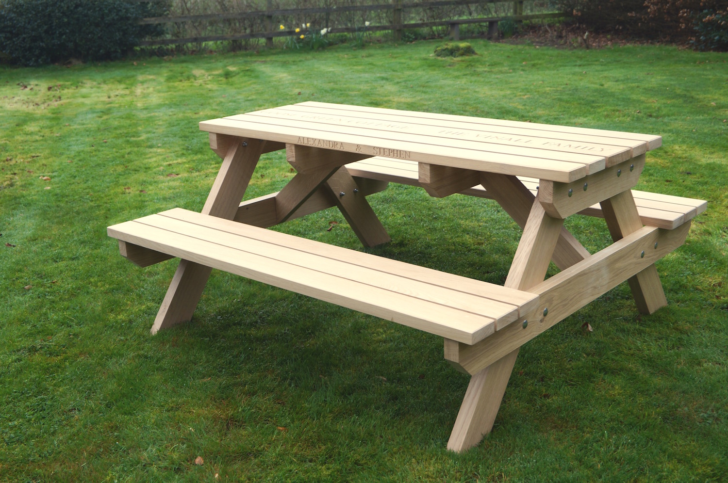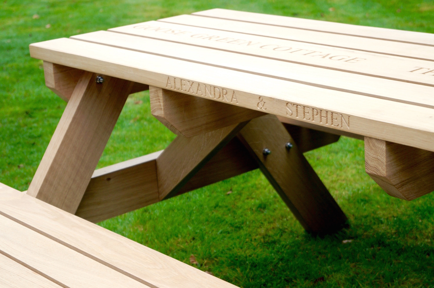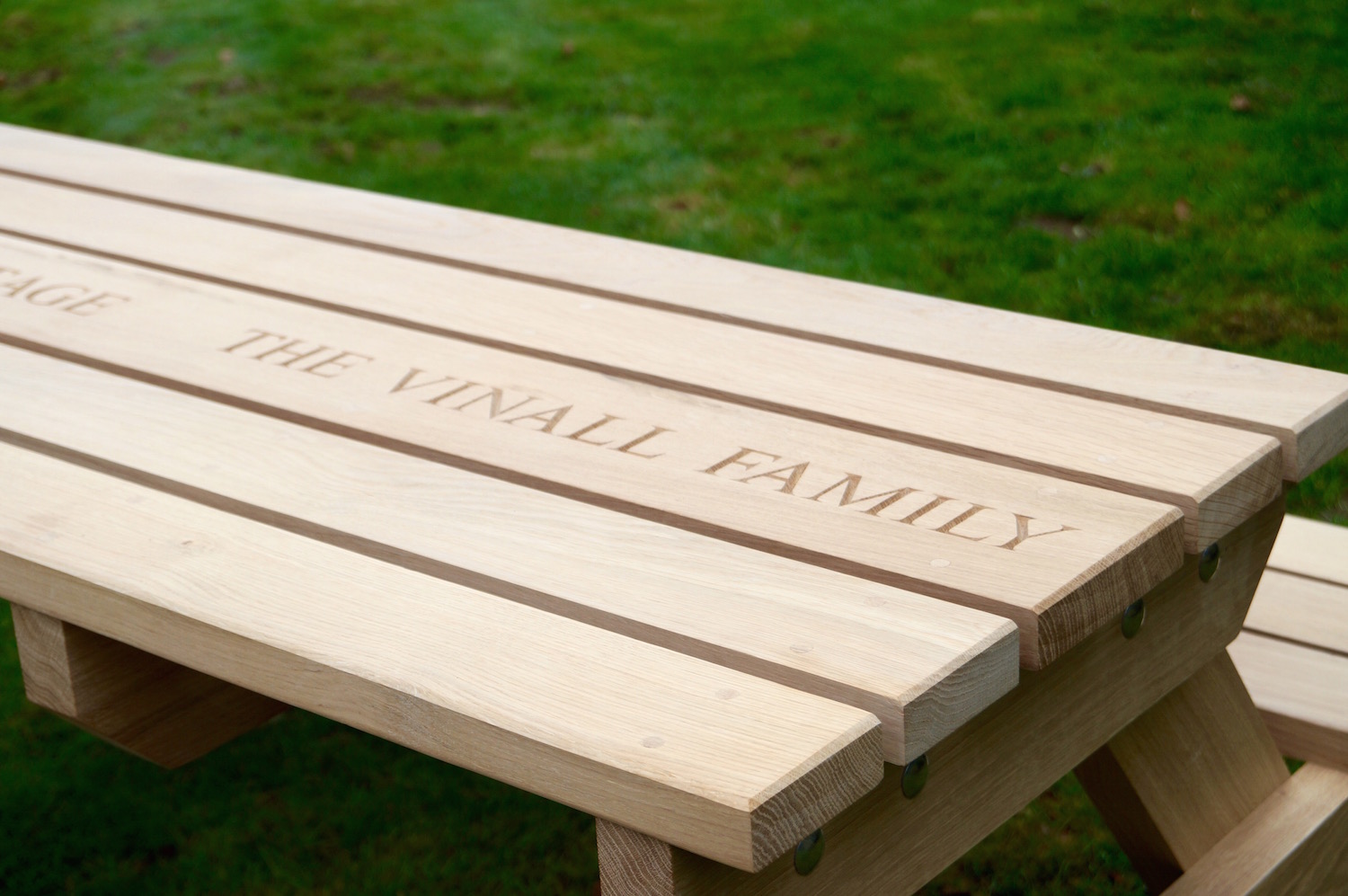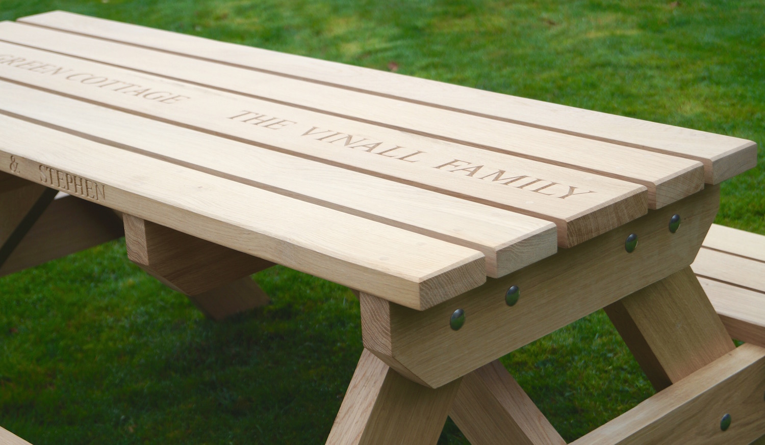 Our beautiful oak picnic benches can be personalised with words or lettering of your choice on either the top central table rail, on the side edges on the tabletop or on the side edges of the bench seats – or all of these places. Perfect for names, dates, house name, a favourite poem, quote or saying. For 5th wedding anniversary, weddings, milestone birthdays or just because you want a good quality handmade picnic table for your garden or grounds. You are going to love it!